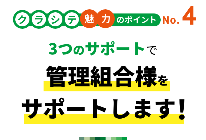 - 管理費の設定額をあげなければならない事態に陥り困っていましたが、クラシテ社にしてから、委託業務費の削減はもちろん、駐車場の空き対策、不要な業務の削減などから、私達の毎月の管理費の負担額も減額できました。